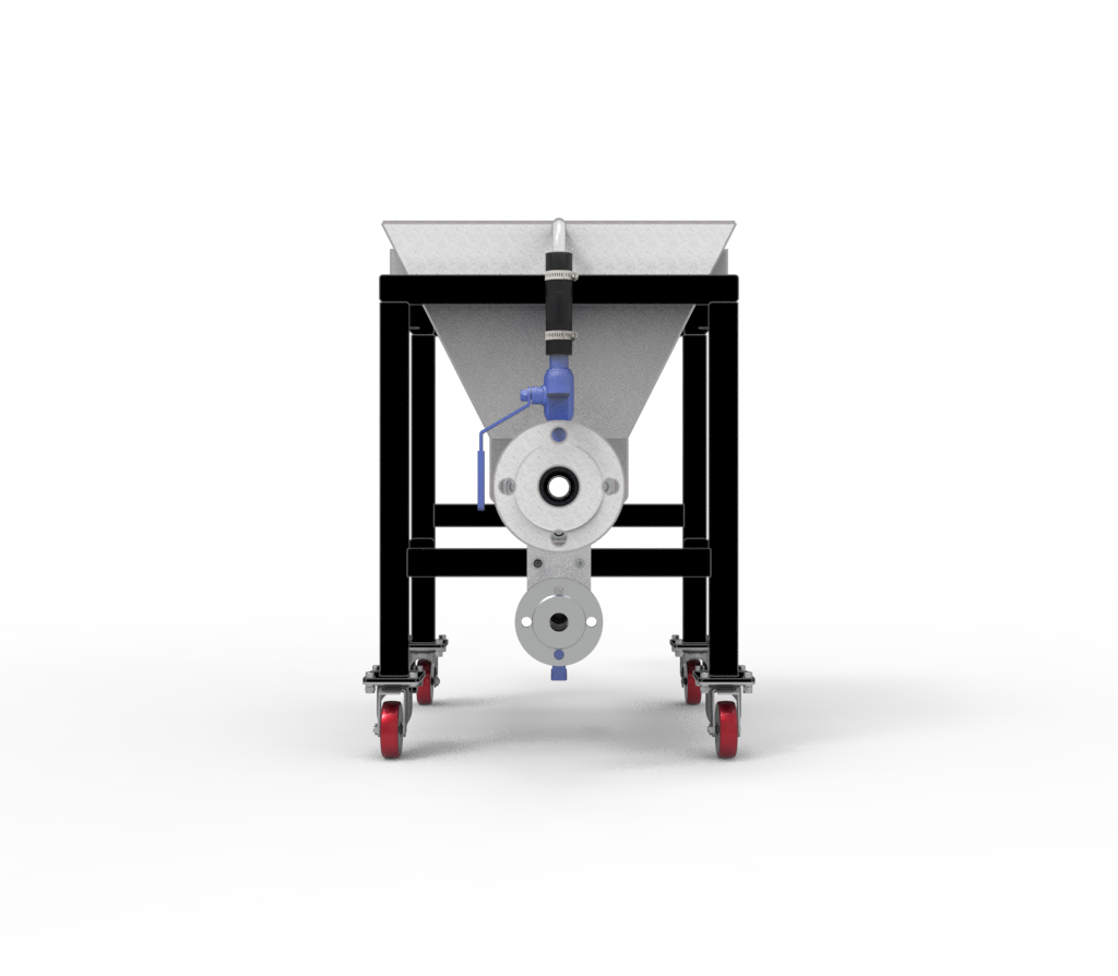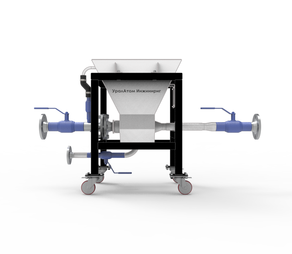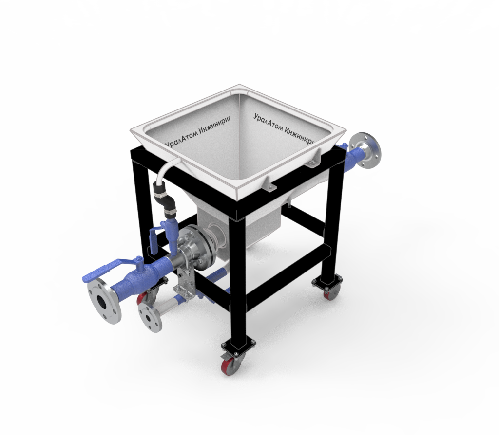 Через штуцер по гибкому трубопроводу в установку поступает вода. Постепенно в бункер засыпают смолу. Смола поступает равномерно, чтобы избежать разбрызгивания воды через бункер. Затем состав проходит через камеру смешения и выходит через штуцер в гибкий трубопровод. Состав под давлением воды в системе поднимается на высоту подачи смолы в фильтр.