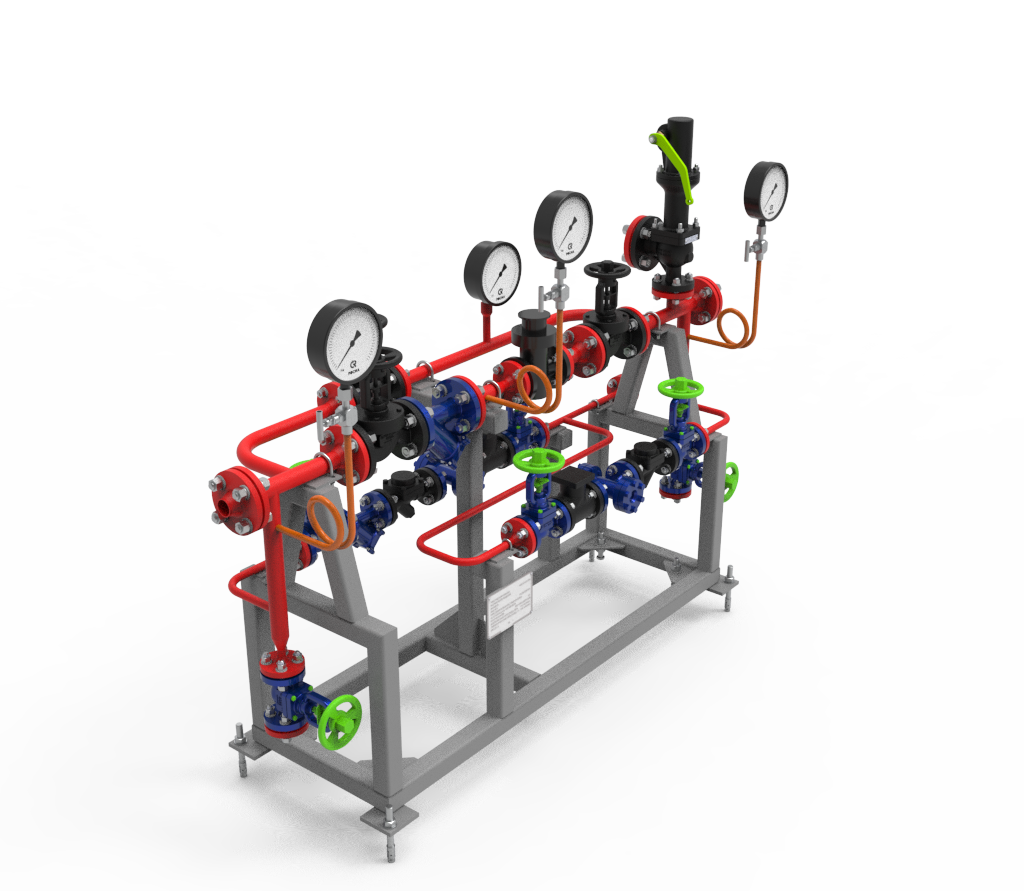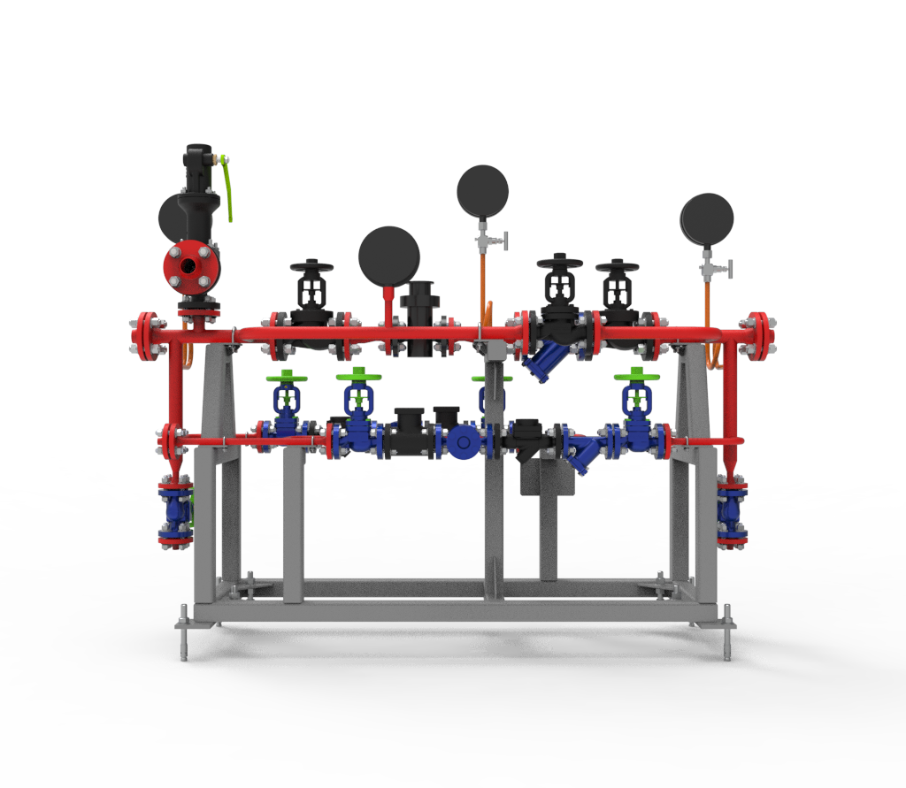 Представляет собой два вертикальных коллектора, соединённых между собой тремя горизонтальными участками. На левом коллекторе в верхней части предусмотрены штуцеры для подачи исходного пара, в нижней части – для выдачи конденсата (опорожнения коллектора при обслуживании). На правом коллекторе в верхней части предусмотрен штуцер для отвода пара сниженного давления, в нижней части – для выдачи конденсата (опорожнения коллектора при обслуживании). На верхнем горизонтальном участке установлен патрубок для слива накопившегося конденсата при обслуживании линии. Нижняя линия в центральной части имеет патрубок для слива конденсата при эксплуатации станции.