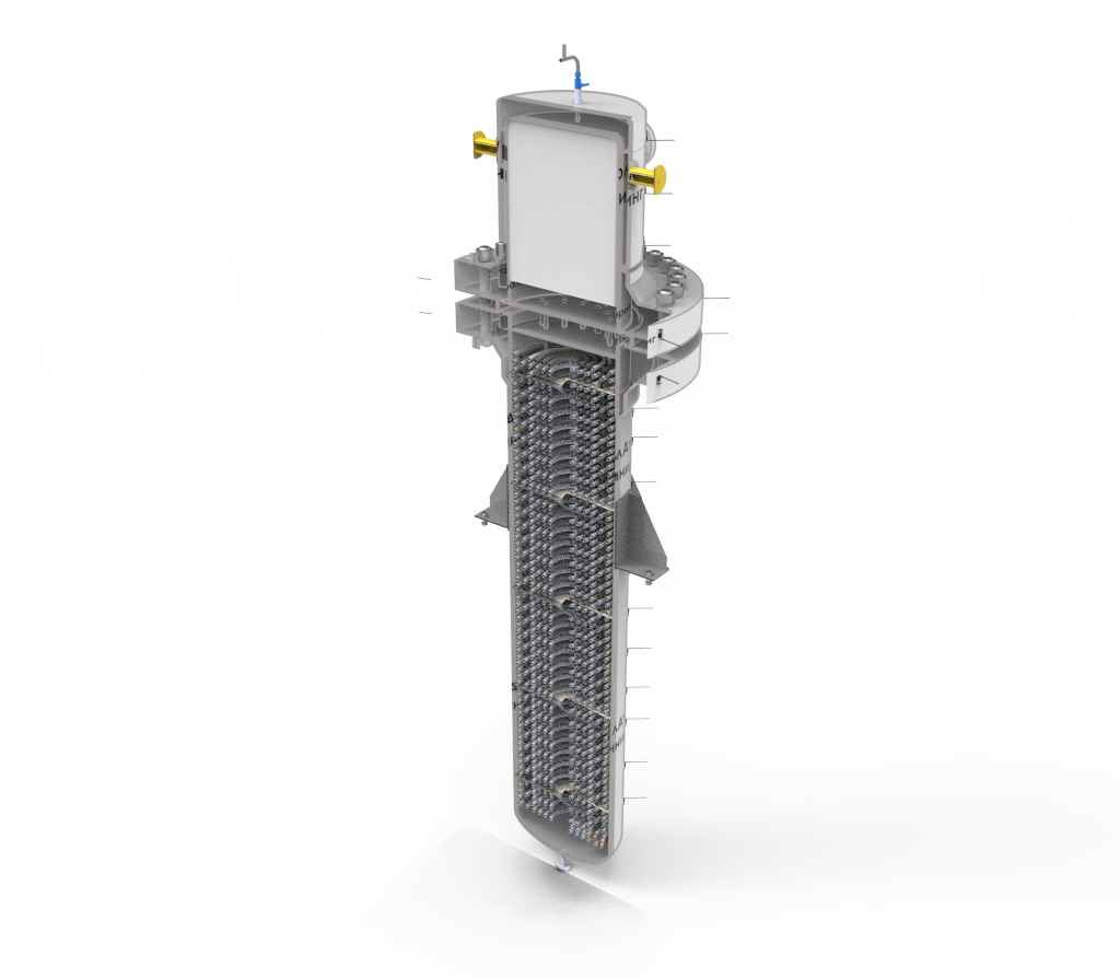 Скруббер снабжен опорами, штуцерами входа/выхода газа, подачи натриевой щелочи, технической воды, резервными штуцерами, штуцерами под контрольно-измерительные приборы, люками, смотровыми окнами.